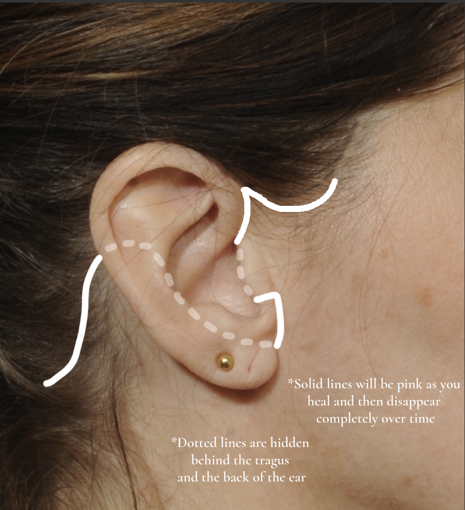Scars are a major concern for many individuals considering a facelift. Facelift incisions are designed to be camouflaged within the natural creases around your hairline and ear. Dr. Hu closes these incisions meticulously and under no tension, which is the best technique to reduce their appearance as they heal. The one variability in incision placement is the portion that runs along the tragal cartilage. In patients with a flat or blunted tragus as well as an obvious crease in front of it, the incision may be placed in the natural crease instead of behind the tragus, since this tends to heal better and produce more natural results. These two variations are depicted in the photos to the right. Once healing is complete, the incisions should be barely perceptible and completely faded into the surrounding skin.